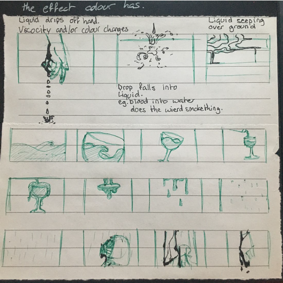 This is a study of the feeling of liquids. Basic idea was to animate water effects, use loops and reuse animation but change the colours to make it look like a different type of liquid. I want to draw attention to the effect colour can have on perception, as well as the tactile experience of touching water.