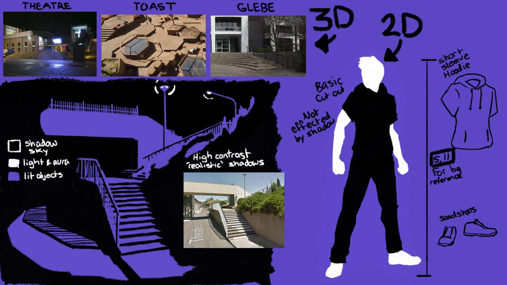 This project was a study of parkour, specifically the parkour scene in Civic Canberra. It’s mixed media and used a 3D modeled environment with a 2D character in it. The 3D environment is modeled as accurately to the real life place as possible, a location the local parkour-ites call ‘Toast’ (cause there used to be a store called toast there).